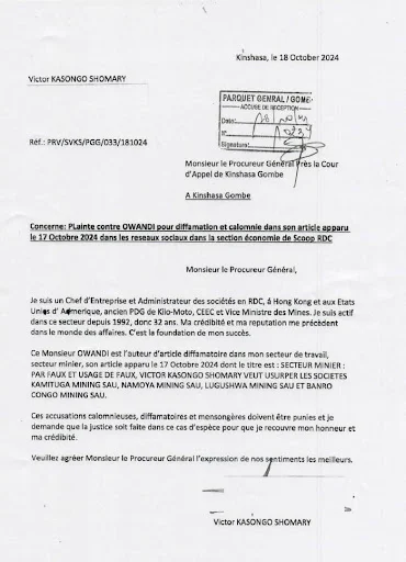 “Ce Monsieur OWANDI est l'auteur d'article diffamatoire dans mon secteur de travail, secteur minier, son article paru le 17 Octobre 2024 dont le titre est: SECTEUR MINIER: PAR FAUX ET USAGE DE FAUX, VICTOR KASONGO SHOMARY VEUT USURPER LES SOCIETES KAMITUGA MINING SAU, NAMOYA MINING SAU, LUGUSHWA MINING SAU ET BANRO CONGO MINING SAU.